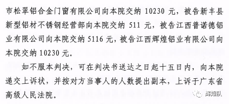 佛山凤铝系列维权案:诉辉煌公司等四被告,法院判赔250余万